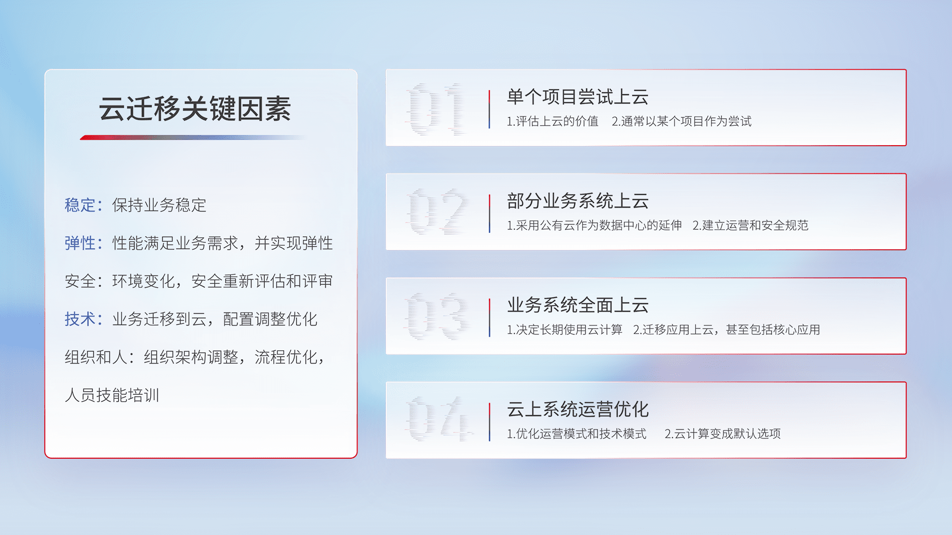 结合实际业务,,,从规划设计、、云平台选型、、、、云原生改造、、、数据迁移、、、、集成交付,,,迁移全过程为客户识别最佳上云路径,,,做好风险识别管理,,,,设计网络架构、、身份权限、、安全审计合规、、、操作审计、、日志审计、、、、监控告警策略、、多站点容灾设计等,,对云上基础设施进行整体规划,,,,提升IT治理水平,,,,以满足弹性、、、、高可用、、、、高性能的需求。。。。