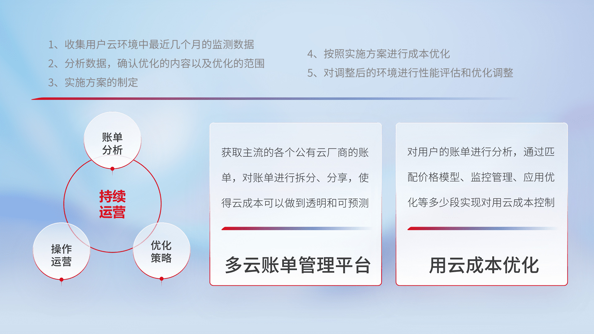 通过多云纳管,,,,以统一的资源数据模型把客户的云资源进行抽象和封装,,,,进而实现对多云资源的统一操作,,,保障云资源管理的可靠性、、、、稳定性与可用性。。。。量身定制化运维内容,,,,配置、、、开发运维、、补丁管理、、备份、、、、监控、、、认证和访问管理、、、审计和日常巡检等,,,保障在用云过程中的可靠度,,,稳定度以及高可用率。。。。